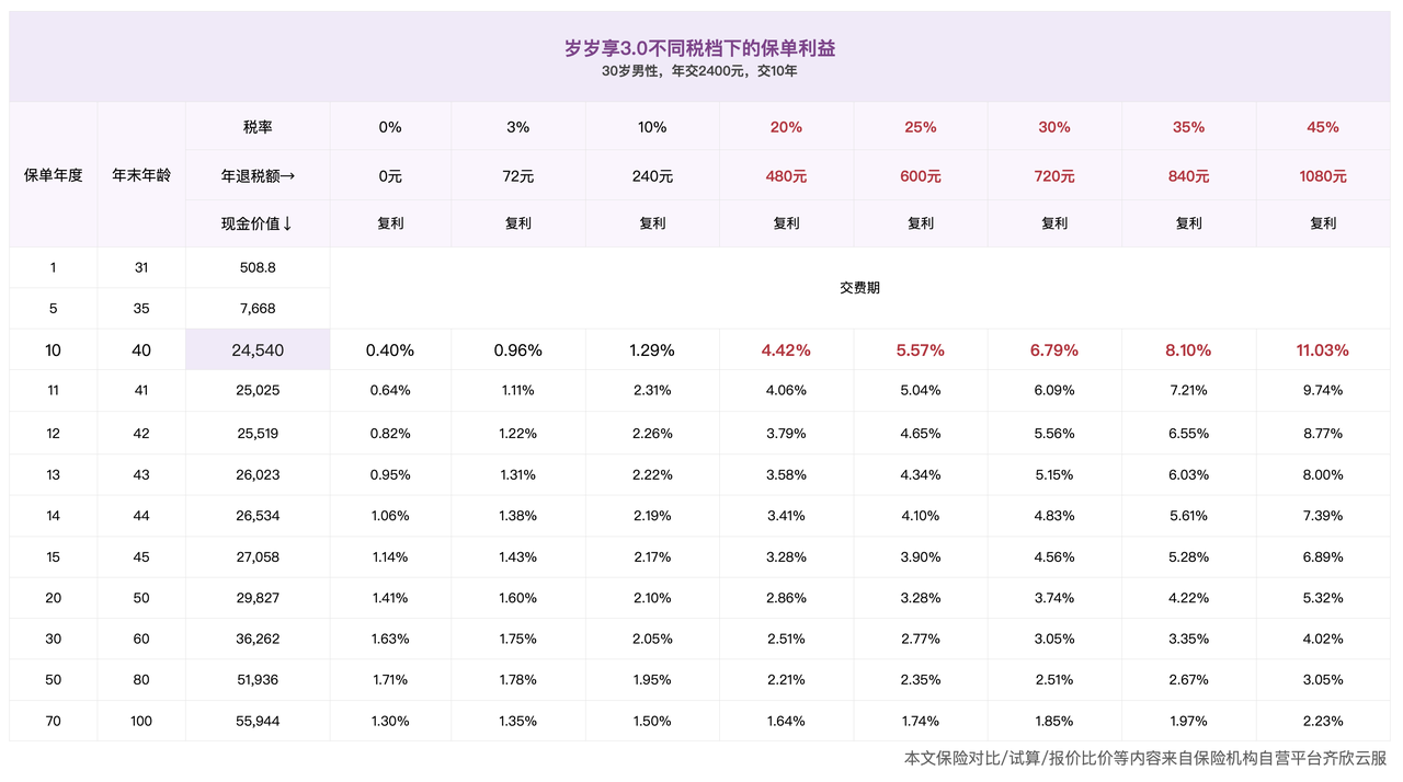 以一位 30 岁女性为例,假设她的税率为 20%,选择 10 年缴费,每年保费为 2400 元。每年退税 480 元,10 年后选择退保,可以拿回 24540 元,IRR 可以突破 4.42%。税档越高,保险利益越好。在当前的利率环境下,这样的收益表现已经相当不错。