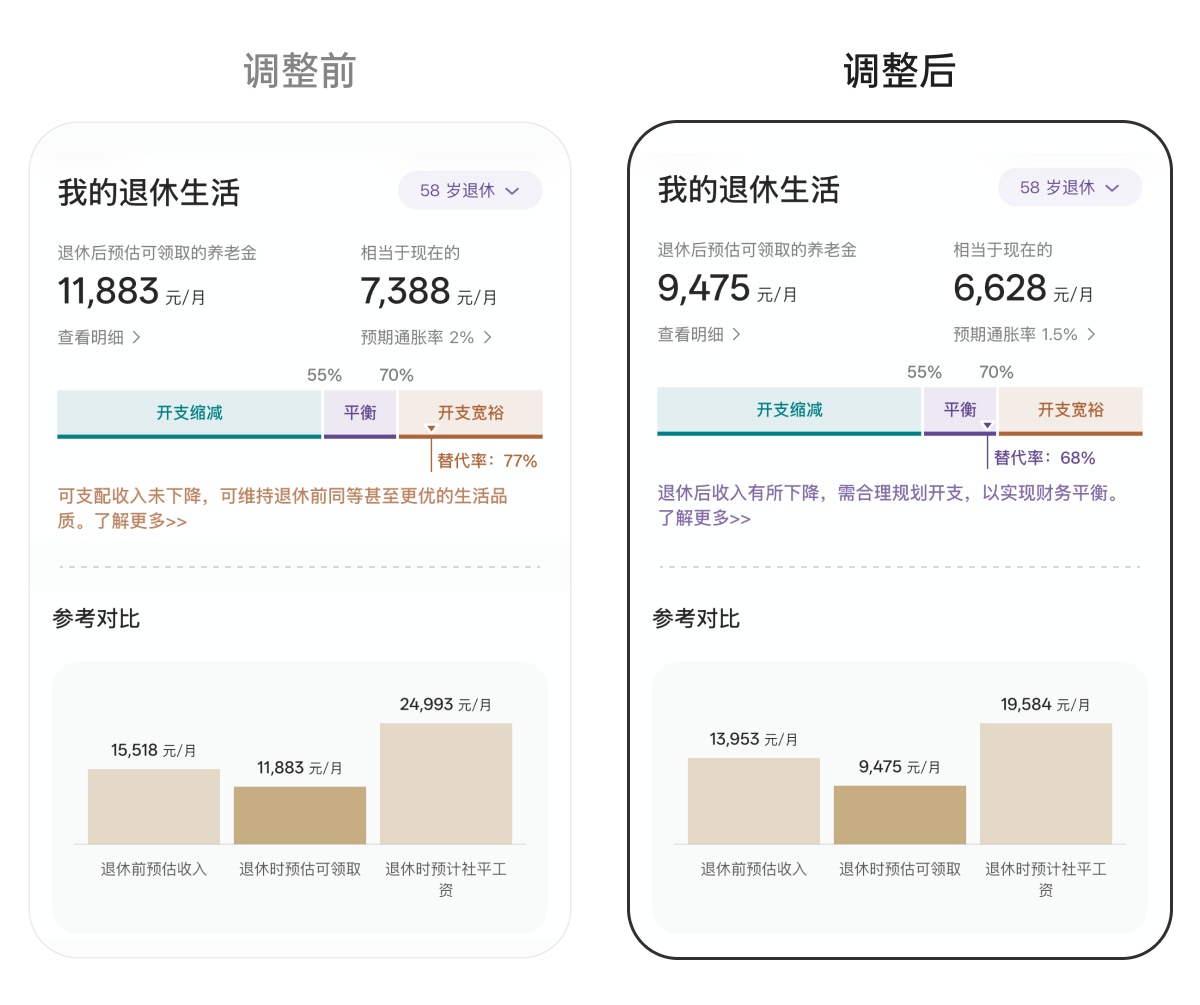 插图:参数调整前后,养老金计算器的退休生活估算