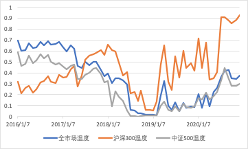 由于要考虑一定的周期,沪深300的温度从 2013 年才有,中证500的温度是从 2015 年才有,我们从 2016 年 1 月开始进行统计,具体见下图: