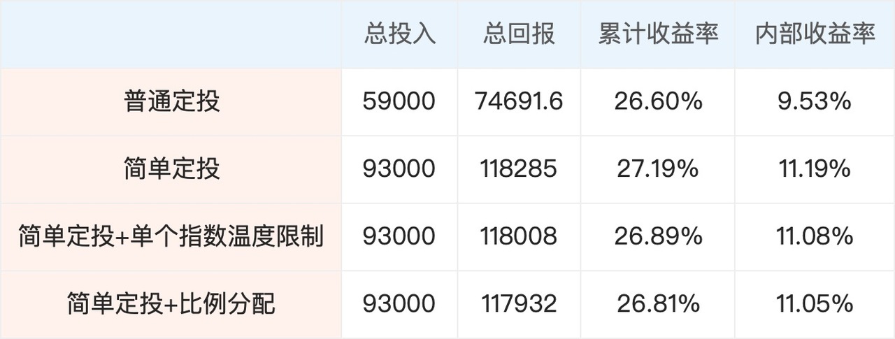 4)简单定投+比例分配:在简单定投的基础上,依据沪深300、中证500的温度情况进行比例分配,温度高的少配置,温度低的多配置。