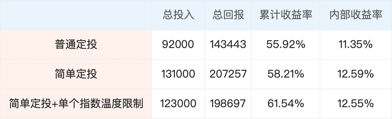 从结果来看,除了普通定投,其他 3 种策略由于在全市场股市温度低估时都加倍定投,所以累计总投入更多,相应的总回报更多。从收益率来看,累计收益率差距不大,但内部收益率上后 3 个差异不大,但都比普通定投要好。