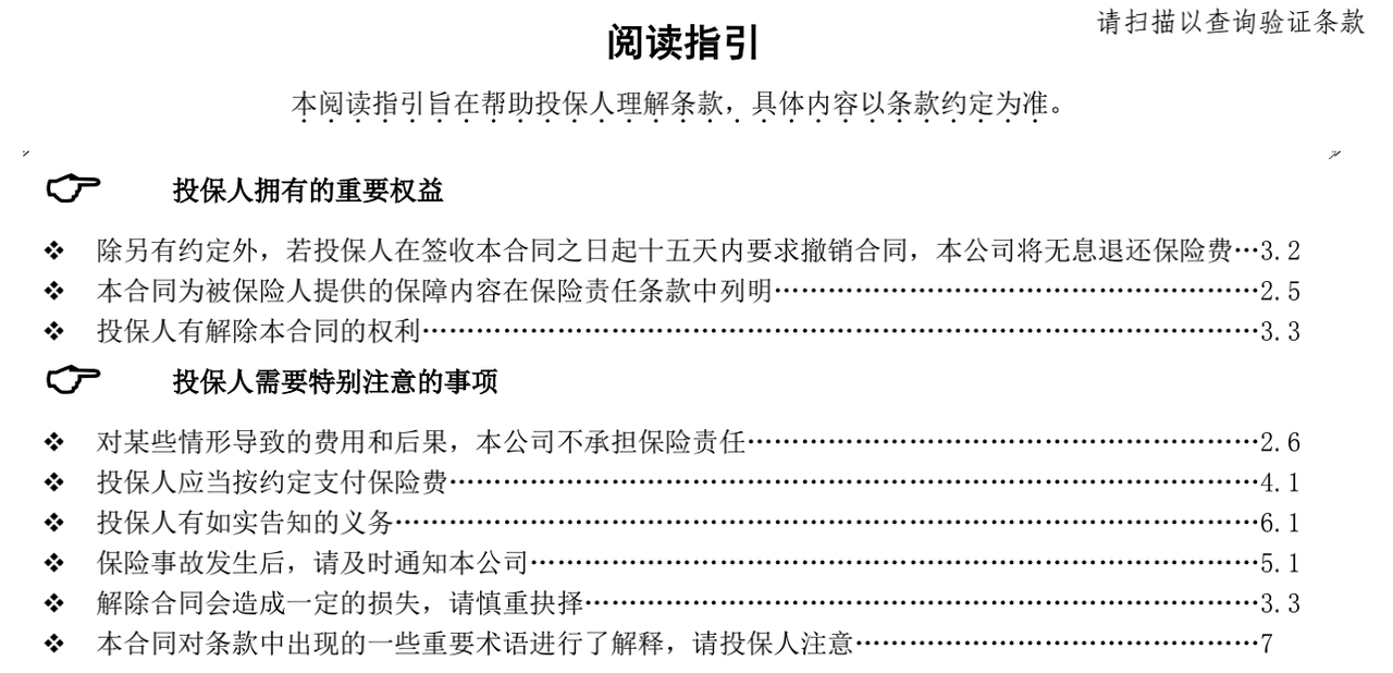 先说第一部分,保险合同确实厚厚一本,但并不需要我们逐条理解吃透,关键是搞清楚哪些需要重点关注,哪些粗略了解就可以。其实,在保险合同的阅读指引中,已经标明哪些是需要重点阅读的。