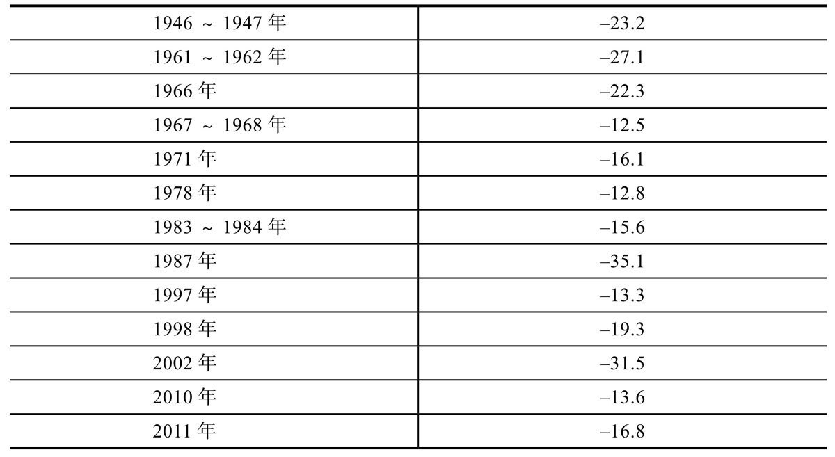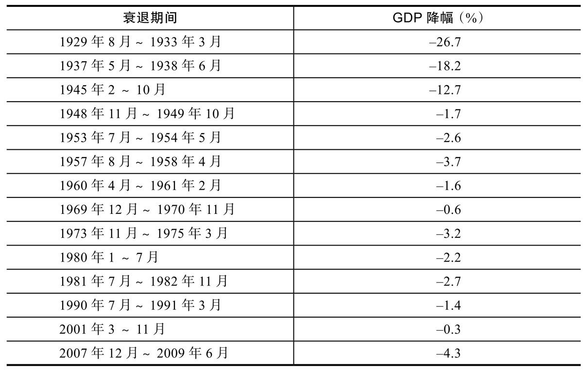 1928 年以来,美国经济平均每 5 年就经历 1 年的衰退,时间占比为 20%。在此期间,两次衰退之间的最长间隔时间是 10 年(1991~2001 年)。衰退令人痛苦,但是从某种程度上来说,每次衰退都处于强烈的经济复苏之间,而人们很容易忘记衰退,将其视为经济周期涨跌起落的自然结果。下表显示了美国经济衰退的频繁程度。