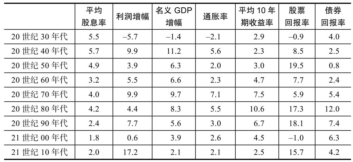试图在这些数据中找到一个规律。你会发现从这个 10 年到下一个 10 年没有任何逻辑或缘由。没有单个指标或变量能够给投资者提供独门武器。市场上唯一不变的就是市场按周期运行的事实。没有事情永远往一个方向发展。