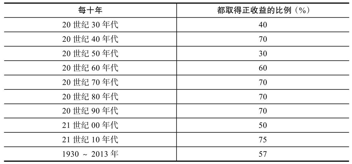 在某些 10 年期内,你看到的数字较少。如从 1973 年年初至 1980 年年末,股市花了近 8 年的时间才创出历史新高。从 2000 年 3 月至 2007 年 5 月,又花了大约 7 年时间。从 2007 年的高点至 2013 年年初,又花了 5 年半的时间。