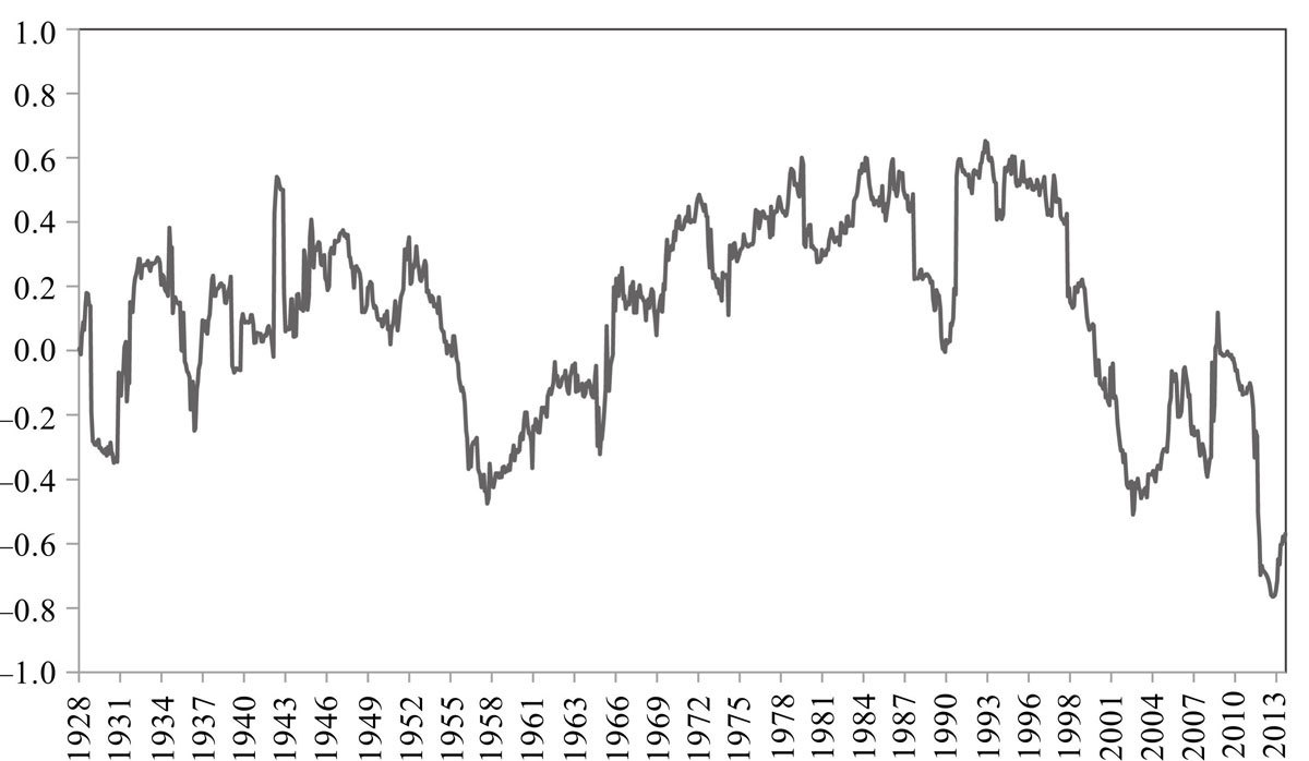 股票和债券的关系并不是一成不变的,就像金融市场上其他所有投资品种。在很长的时间窗口下,这两种不同的资产类别的相关性接近零。以外行人的话来说,这意味着这两类资产的价格走势,没有正相关也没有负相关。虽然这两类资产很多时候同时表现良好,但并不意味着它们彼此步调一致。随着时间推移这种关系还会改变。下图显示这两种资产的相关性的变化情况。有时它们同时上涨,其他时候它们走势完全相反,大多数时候这两类资产的走势缺乏可识别的模式。
