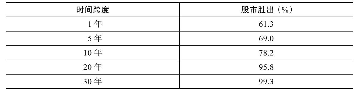 虽然在经济危机和股市下跌时期,债券投资较为安全,但这并不意味着股票比债券风险更大。风险是一个很难定义的概念。在不同的时间窗口,对不同的投资者而言,风险也有所不同。虽然股市崩盘的损失比债券投资的损失严重得多,但时间跨度越长,债券相对于股票的吸引力逐渐减弱,直至完全消失(见下表)。