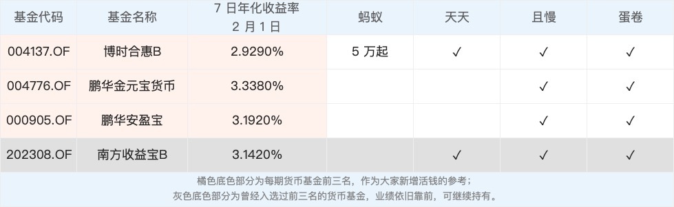 最后,附上最新的货币基金表现排名,前三名的货币基金出现了较大变化。其中,长城收益宝A上周收益突然大幅下降,本期综合表现直接跌出了所有货币基金的前 10%,建议持有它的小伙伴直接换掉。南方收益宝B也从本期前三名中掉出,但收益依旧排在靠前的位置,目前可继续持有,我们会持续跟踪该基金表现,需要更换时再通知大家。