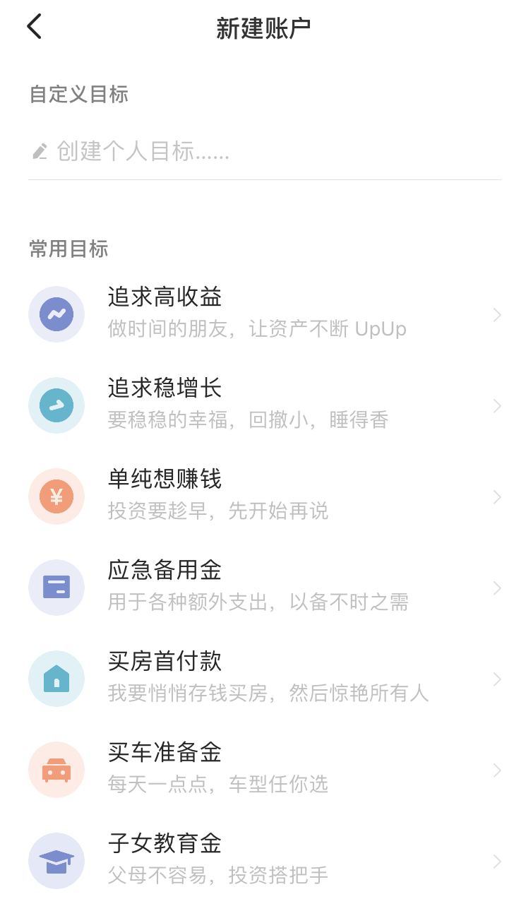 你可以从常用目标中选择也可以在「自定义目标」中创建。创建时最好是根据自己的投资目标创建,不要只是一个简单的渠道名称(比如:支付宝),后续我们会从功能上支持一个账户记录多渠道资产的。