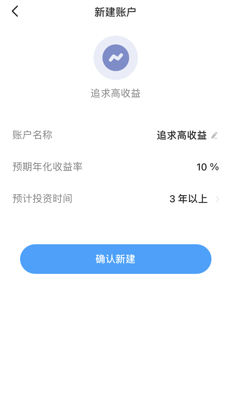 选好目标后,你可以先给自己的账户起一个自己喜欢的名字,然后再填写下自己的预期年化收益率和自己预计的投资时间。