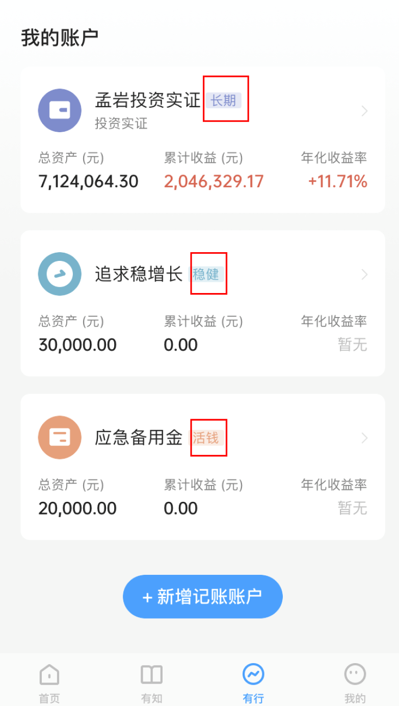 有个问题,比如我有两部分钱,一部分是自己的,一部分是父母的。两部分钱里面又分别区分了短期、中期、长期三部分。 这种情况下是建两个账户还是6个呢?感觉建6个比较合适,但是这样就没办法看父母账户的总统计和我自己账户的总统计了