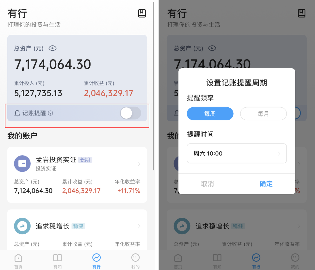 开启记账提醒后,我们会按照你的设置来发送 App 通知提醒你来记账,你可以选择按周或者是按月,这样的目的是帮你养成一个定期资产检视的习惯。我们不能每天都关注市场,那会让你离市场太近,太容易受市场情绪的影响,也不能对市场漠不关心,这也会让你错失很多机会。