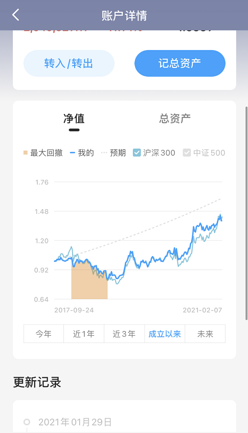 我们会提供给你沪深300中证500作为业绩参考标准,你可以与之比较,看是否跑赢了大盘。我们还帮你画出了预期曲线,依据是设立账户的时候填写的「预期年化收益率」和你选择的「预计投资时间」,你能用它观察实际投资和目标之间有多大的距离。