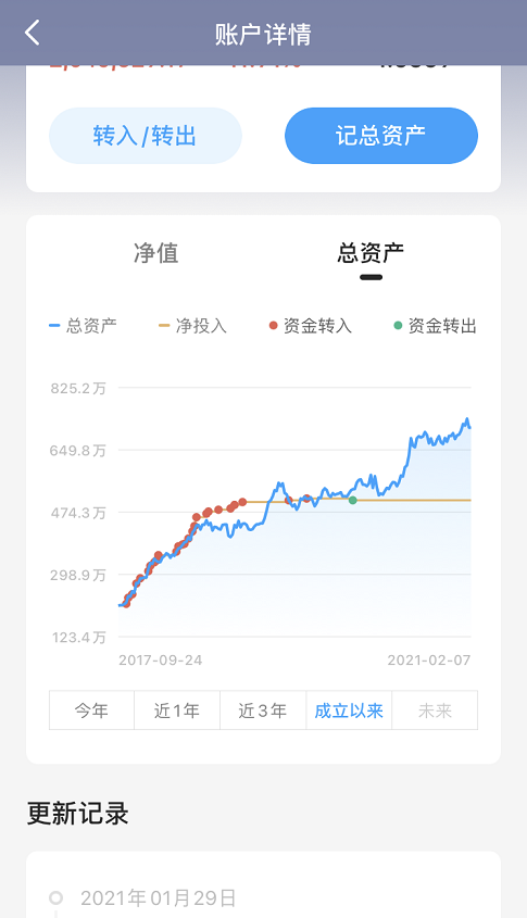这些记录的总资产将和转入转出数据将一起构成我们计算各种指标的数据基础。如果未来你发现展示的图表有异常,或者年化收益率等数据异常,那么大概率是你更新这些基础数据时候出现了问题。后续我们也会提供相应的查询工具,来方便你检查。