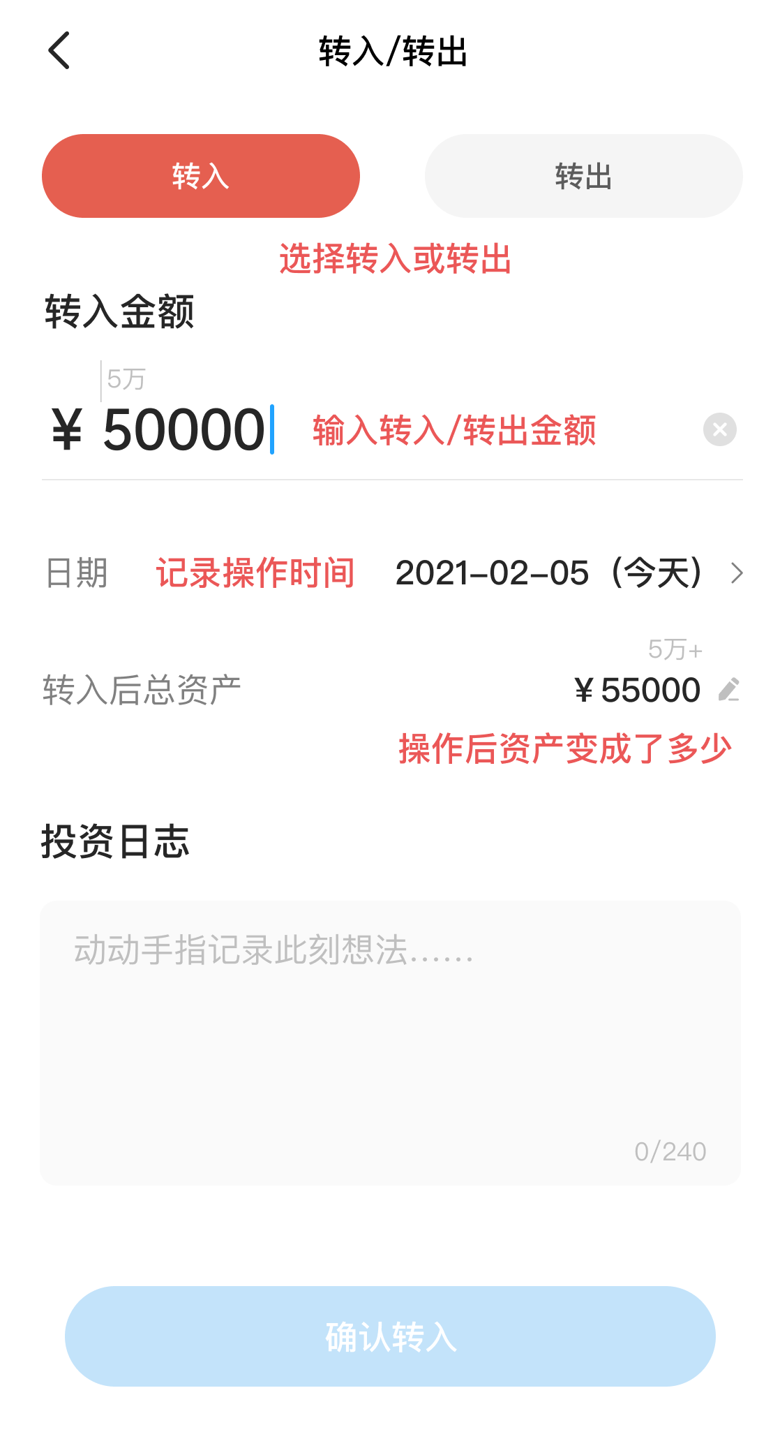录入「转入 / 转出」才能算清楚年化收益率,所以最好的情况是有转入转出发生时就来记一笔。当然,你可能当时忘了,或者想周末一起记录,没有问题,几天的时间误差对年化收益率造成的影响基本可以忽略不计。