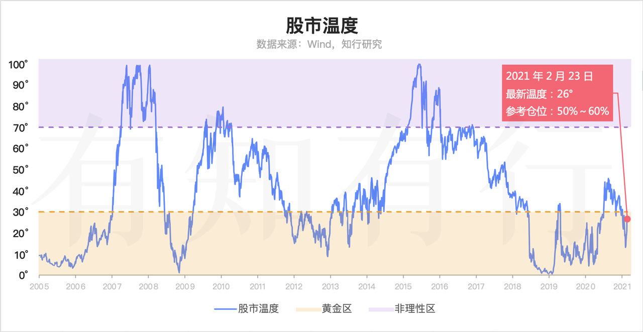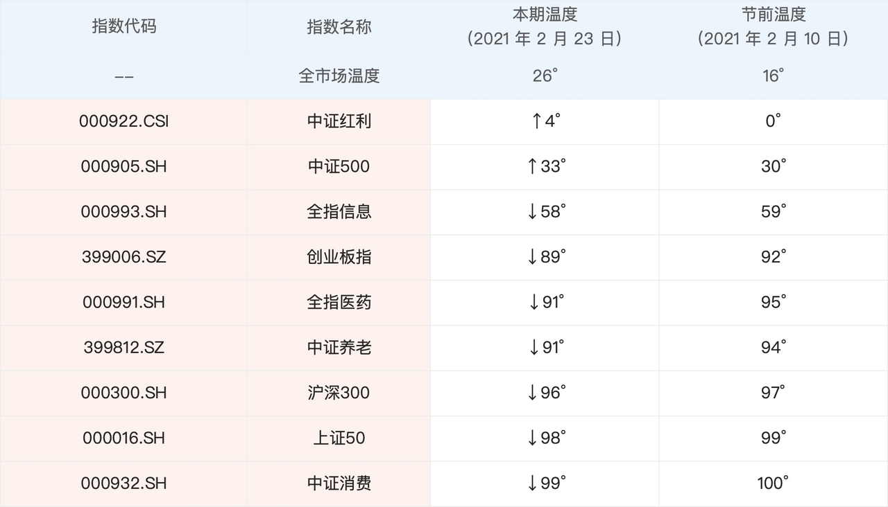 受此影响,即便指数表现一般,但全市场的股市温度却出现了快速提升。春节之前那一周股市温度最低到了 13°,而最新温度为 26°。