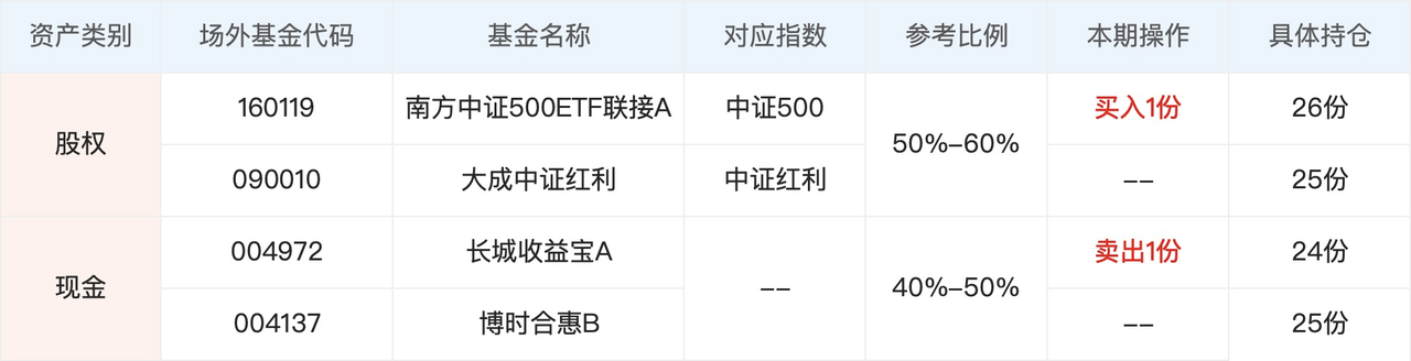 由于中证红利已经加满,本期仅发车一份中证500。老用户可以按照发车信号买入。新用户如果有买入计划的话,直接按照下图,把自己的投入资金分成 100 份,分别买入中证500指数基金 26 份,买入中证红利指数基金 25 份就好了,其余资金放在货币基金、活期理财里,随时能跟车就行。