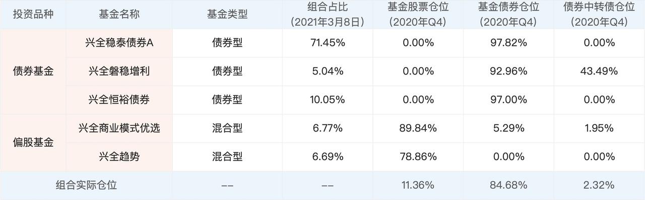 具体来看,主理人认为目前股市风险比较大,降低了偏股型基金的比例。在债券基金方面也进行了结构调整:将偏好可转债投资的兴全磐稳增利的仓位降低了,同时调入了另一只偏好金融债投资的纯债基金进行分散。