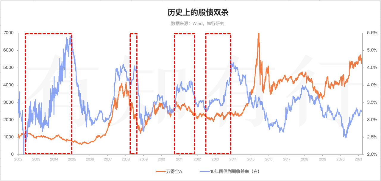 我们统计了国内历史上出现的股债双杀情况,具体见下图红框部分。历史上出现了四次典型的股债双杀,分别是 2002 年 6 月至 2004 年末、2008 年 4 月至 2008 年 8 月、2010 年 11 月至 2011 年 11 月、2012 年 8 月至 2013 年 11 月。在这四个区间里,万得全A代表的全市场股票指数出现下跌,10年国债到期收益率出现上行(意味着债券价格出现下跌)。