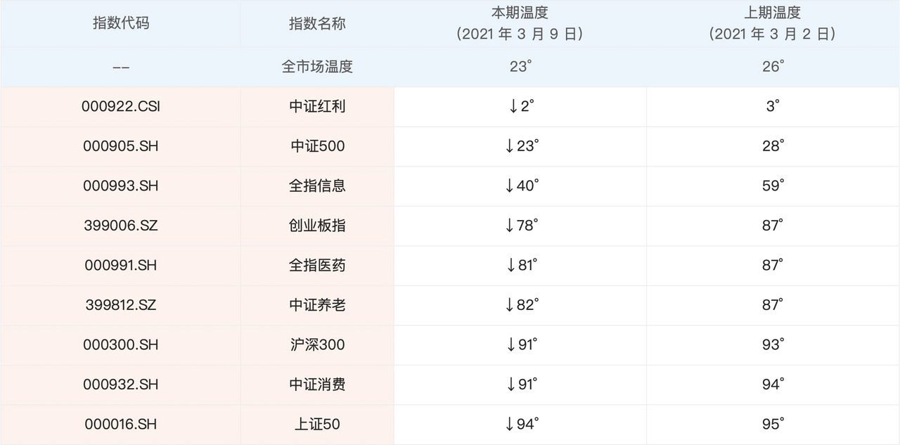 受此影响,我们的股市温度也有所下降,最新股市温度为 23°。具体指数方面,中证红利表现不错,抗压能力很强。全指信息温度下降得很快,最新温度已经降到了 40° ,另外,创业板指随着近期下跌,温度也回落得很快。