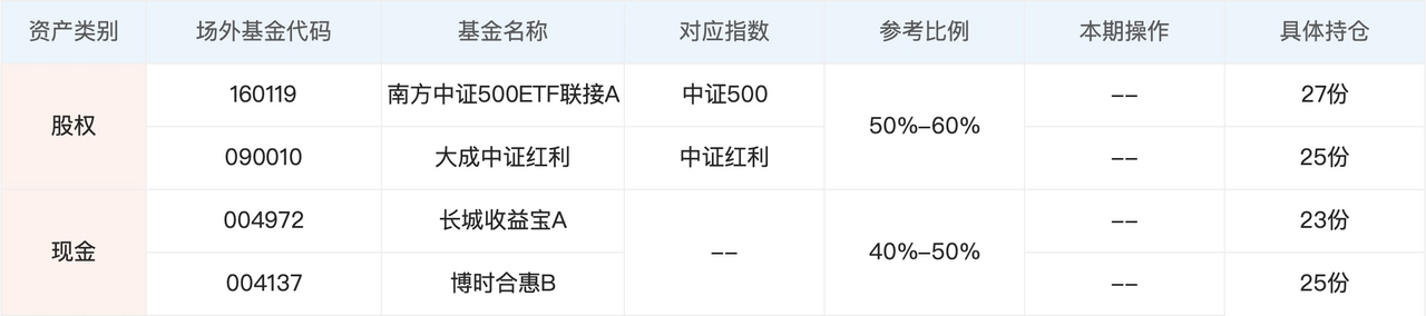 之前没有跟车的,现在仍然可以按照参考持仓进行操作:把自己的投入资金分成 100 份,分别买入中证500指数基金 27 份,买入中证红利指数基金 25 份就好了,其余资金放在货币基金、活期理财里,随时能跟车就行。