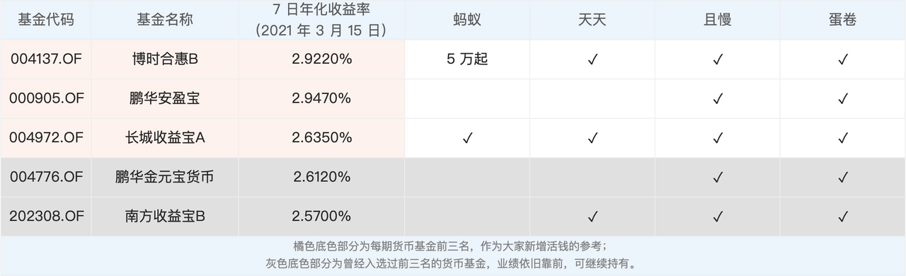 本期货币基金排名前三还是博时合惠B、鹏华安盈宝和长城收益宝A,与上周一致。