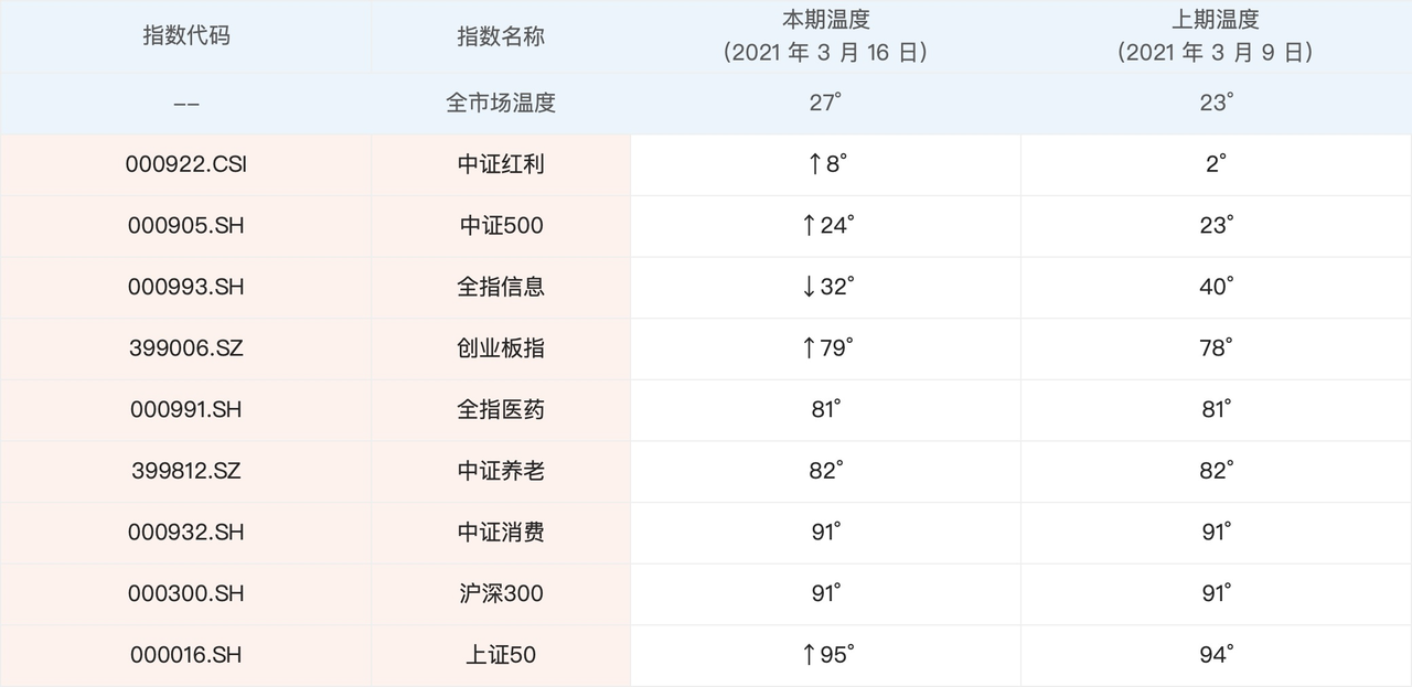 最新股市温度是 27°,跟上期相比,小幅上涨。具体指数方面,中证红利的温度上升得很快,估计很多人都有这种感觉,今年到现在就指着红利上涨了,中证红利今年以来已经上涨了 6.33%了 。现在还处于低估区域,还可以购买,未来如果上涨很快,到时候新进入的用户大概率就买不到了。另外,全指信息温度下降的很快,其他变化不大。