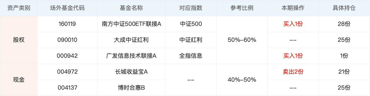 根据最新股市温度,我们的参考仓位是 50%~60%。目前我们的持仓还处于参考仓位的下限,估计熟悉我们策略的人已经猜到了我们今天会发车,是的,本期发车两份:一份中证500,一份全指信息之前跟车的朋友,用自己的现金部分跟车就行。新用户按照下面的具体持仓,进行买入即可。