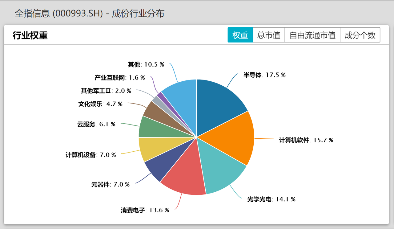 全指信息全称是「中证全指信息技术指数」,是中证全指行业指数系列中的一员,发布时间是 2011 年 8 月。下面是全指信息的行业分布情况,我们能看到它主要覆盖电子、计算机等行业,细分行业包括半导体、计算机软件、光学光电、消费电子等。热门的 5G 通信概念也包含在内。