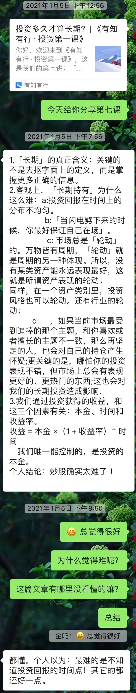 到课程后期,我发现他在看完课程后会主动给我发笔记,而且笔记越来越有条理,还会结合自己的生活经历,加一些自己的感想。虽然这个过程大部分还是围绕在投资知识本身,但是时不时会延伸到我们彼此生活的内容,我感觉到我们互相都变得更加善于表达和沟通了。