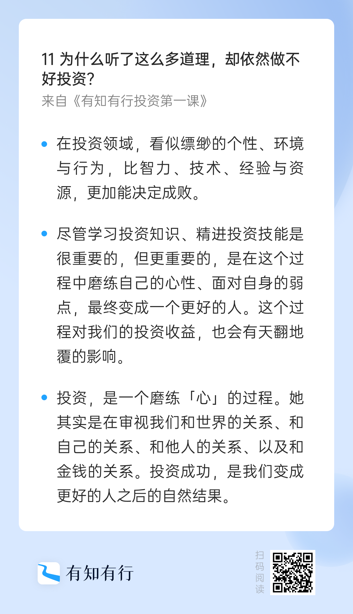 投资,是为了成为更好的自己。恭喜你在《有知有行·投资第一课》开启投资之旅的第一步,这里有一群同路人,我们一起走得更远。