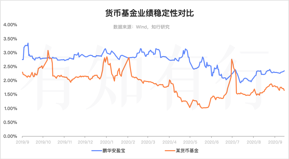 所以,我们在挑选货币基金的时候,不能只关注货币基金最新的短期收益,还要关注其近期一段时间(比如一个月左右)的收益表现。下图,我们对比了某只收益不稳定的货币基金和鹏华安盈宝的七日年化收益率。尽管这只基金的七日年化收益率偶尔能够超过鹏华安盈宝,但其收益波动很大,大部分时间的收益并不好。