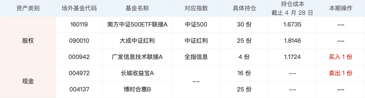 之前没跟过车的用户,可以参考下面的持仓,把本金分成 100 份,按照具体持仓一次性买入。目前这几个品种的估值都不高。