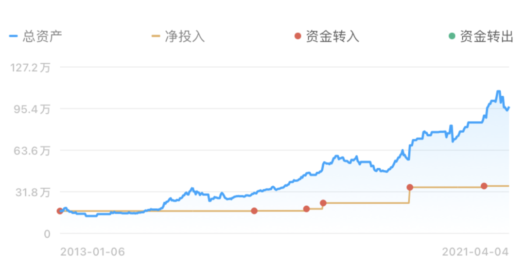 在这期间,主要的资金进出,分别是 2012 年底的 17 万,以及 2019 年 6 月 的 12 万,加上其它一些小额的「转入」,净投入是 36 万。