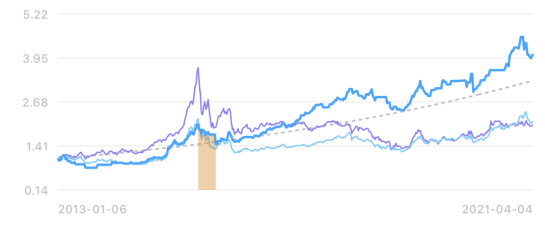 从 2013 年 1 月到现在的 8 年时间里,沪深 300 和中证 500 的收益其实差不多,分别是 104% 和 94%。终点差不多,但过程可完全不一样。