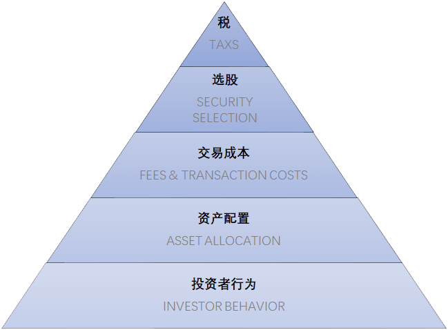摩根·侯塞尔认为,一个投资者的长期投资业绩,受多方面的因素影响,比如投资者行为、资产配置、交易成本、选择股票或者基金等等。在这张图中,越靠下的部分影响越大,对我们最终的投资业绩起到更具决定性的作用。