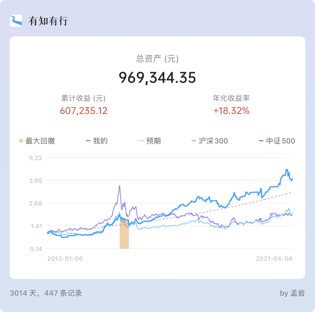 今天为你分享的是孟岩的账户回顾。孟岩从 2013 年元旦起帮妈妈管一笔钱,如今 8 年过去了,年化收益是 18.32%。在这张图和这些数据背后,我想有更多值得我们学习的地方。
