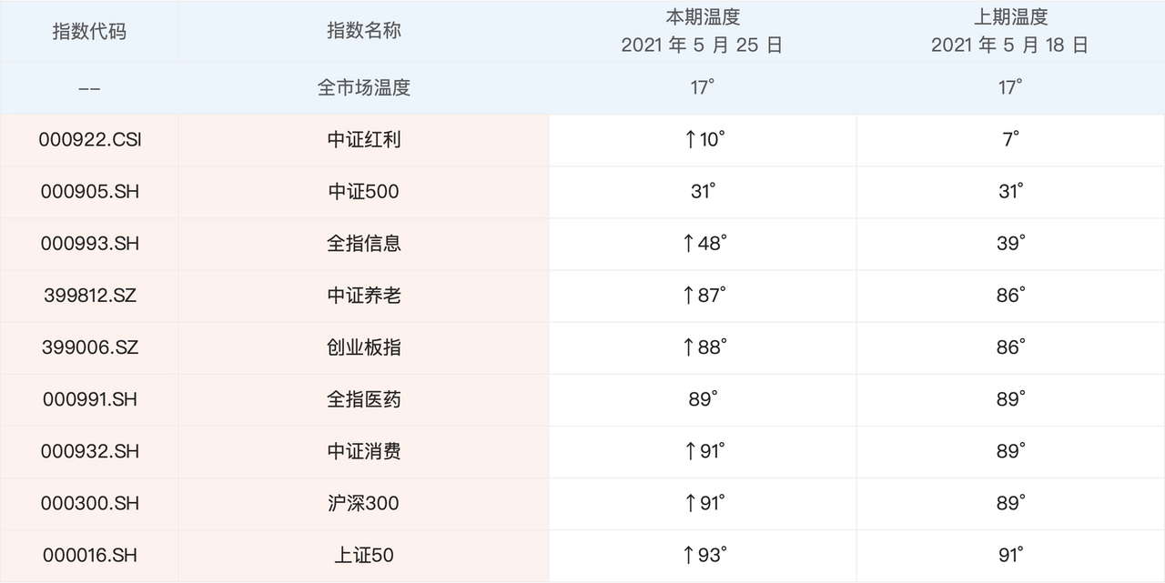 由于涨幅高的是少数的权重股,我们的股市温度跟上周二一样,最新股市温度是 17°。具体指数方面,多数指数温度都出现了上涨。之前下跌,指数大多跌到了 90° 以下,现在上证50、沪深300、中证消费又回到了 90° 以上。