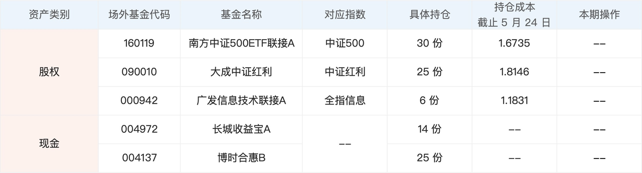 根据最新股市温度和具体指数情况,我们的参考仓位是 60%~70%,本期不发车。下面是我们的持仓情况,目前三个品种都是盈利的,收益率从高到低分别是中证红利、全指信息和中证500。中证红利涨的最多,12% 左右,但估值确实不高。全指信息和中证500涨幅较小。对于还没有入场的新用户,可以一次性补齐,如果内心特别在意成本,也可以参考我们的持仓成本来补入。