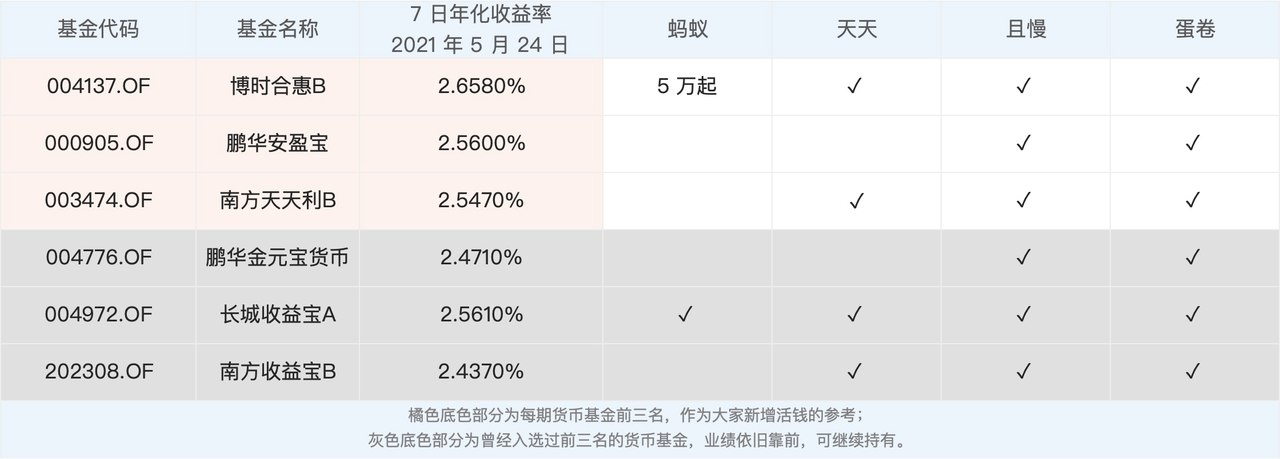 上周,资金面延续充裕,短期市场利率变化不大。最新货币基金平均 7 日年化收益率为 2.1490%,银行活期理财平均 3.1% 左右。新一期的货币基金排名依旧是博时合惠B、鹏华安盈宝、南方天天利B。其中,博时合惠B收益率相当坚挺,今年从未掉出过前三名,可以优先考虑这只。