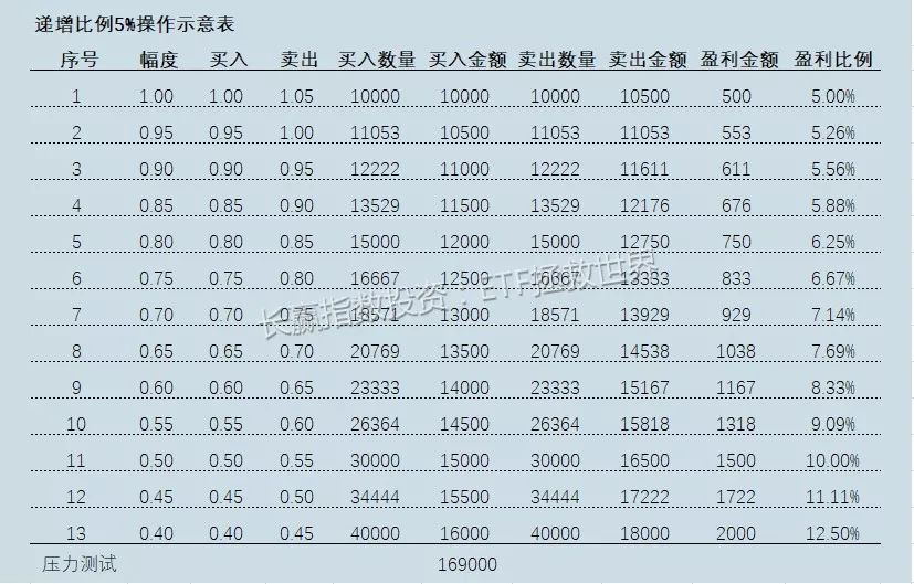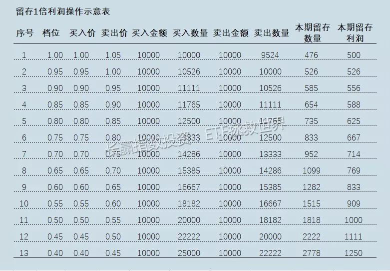 举例,1 元价格买入 10000 元某品种 10000 份。1.05 元卖出 10000 元 9524 份,剩下的 476 份永不卖出,或者到极度高估的情况再卖。