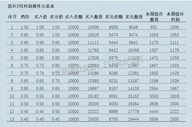 即,1元价格买入 10000 元某品种 10000 份。1.05 元留双份利润,卖出 9048 份 共 9500 元,500 元利润与 500 元本金永不卖出,或者极度高估才卖。