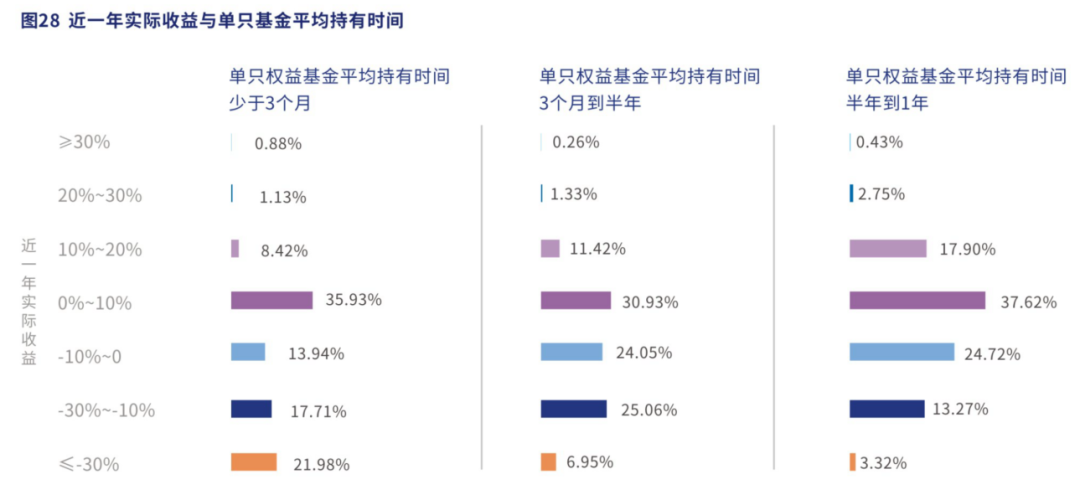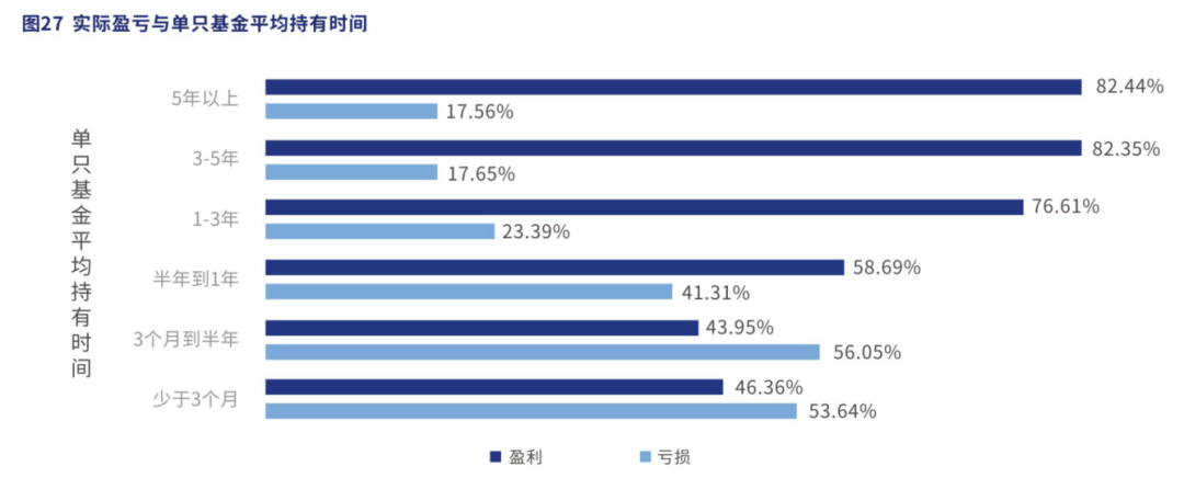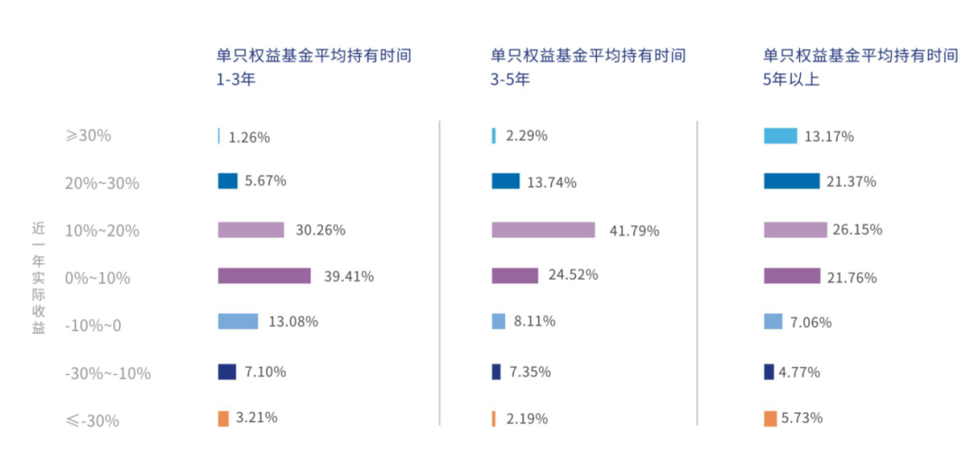 今年年初,行业首份《权益类基金个人投资者调研白皮书》发布,得到最多讨论的,就是一项关于基金投资实际盈亏与单只基金平均持有时间的统计。这份涉及了 3 万多个人投资者的调研报告显示,随着持有时间的拉长,出现大幅亏损的人数锐减,获得高收益的概率上升。