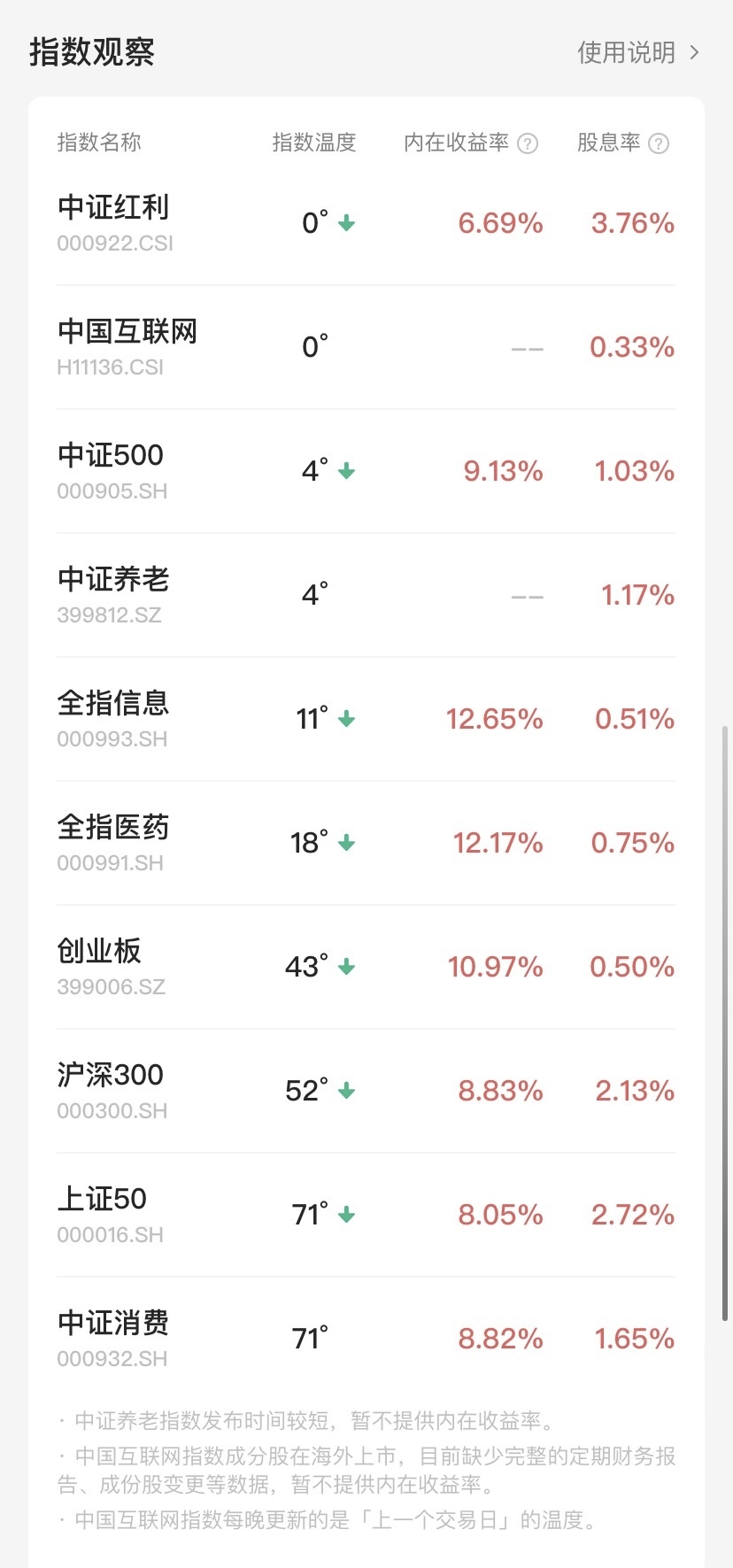 基于此,我们展示了指数温度、内在收益率、股息率这 3 个数据,方便大家对这些指数长期的盈利情况、股息收益情况以及当下的估值情况有清晰的了解。