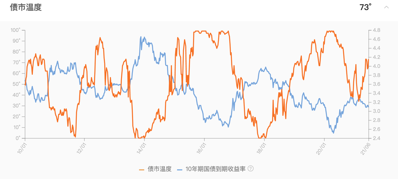 我们在 10 年期国债到期收益率的基础上,计算了债市温度。和股市温度一样,债市温度反映的也是市场情绪热度。温度越高,债市情绪越高,债市处于牛市中。从上面的介绍能够看出,债市温度和 10 年期国债到期收益率的对应关系也是反向的。