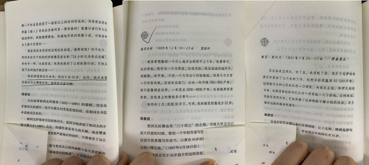 🙇♀️娄娄:其实记不太清是大二还是大三了。因为当时在修外国戏剧史的课程,学到契诃夫的戏剧,我不是从短篇小说,而是从戏剧开始喜欢上契诃夫的。教授说喜欢他的话可以去看看他的书信集,契诃夫的书信是 19 世纪俄罗斯文学的奇观之一。我就去学校图书馆找,找到的版本是那种全集类型的,洋洋洒洒,无甚译著,随后翻了翻就放下了。