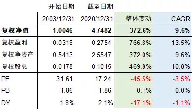 而如果看整体变动,这只指数基金在这 17 年里的净值变动为 372.6%,其中净利润、净资产、股息的变动,分别为 766.8%、372.0%、469.8%,而相对应的 PEPB、DY 的变动分别为 -45.5%、0.1%、-17.1%。