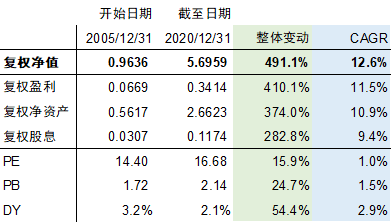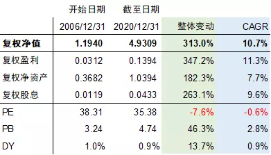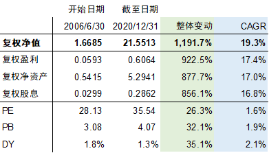 由于基金成立时已经靠近 2005 年年底,考虑到基金建仓需要时间,以及无法查阅到 2005 年年报中所需的整体持仓情况(因为距离时间太近),因此这里选择 2006 年到 2020 年的数据进行研究。 数据显示,在 2006 年 6 月 30 日(基金半年报)到 2020 年 12 月 31 日的 14.5 年里,富国天惠基金净值的 CAGR 为 19.3%,其中由净利润、净资产、股息带来的 CAGR 变动分别为 17.4%、17.0%、16.8%,远超过同期的指数基金,而 PEPB、DY 变动所带来的 CAGR 变化,分别为 1.6%、1.9%、2.1%,几乎可以忽略不计。