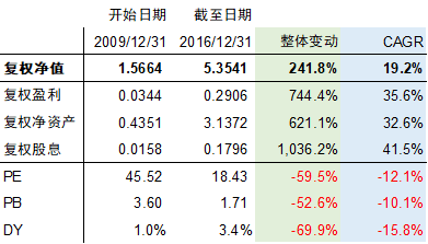数据显示,在 2009 年到 2016 年的 7 年时间里,根据模型的推测,东方红 4 号的复权净值增长了 241.8%(不等于陈光明任期的整体回报,仅为观测期变化),合 CAGR 为 19.2%。同时,投资组合的净利润、净资产和股息分别上涨了 385.5%、1180.2%、957.3%,CAGR 分别为 25.1%、43.5%、39.6%。