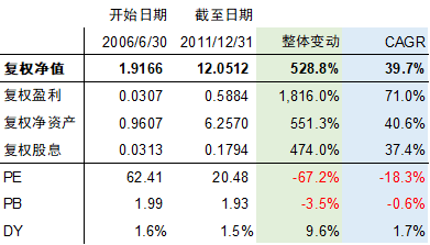 估算的数据显示(估算可能产生的偏差详见上文),在 2006 年 6 月 30 日到 2011 年 12 月 31 日的 5.5 年中,华夏大盘精选复权净值的 CAGR 是 39.7%,其中盈利、净资产和股息带来的 CAGR 分别是 71.0%、40.6%、37.4%,同时 PEPB、DY 带来的 CAGR 分别是 -18.3%、-0.6%、1.7%。